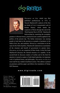 “Discourses on Livy”, which was first published posthumously in 1531, is Niccolo Machiavelli’s analysis of the first ten books of Livy’s monumental work of Roman History, which details the expansion of Rome through the end of the Third Samnite War in 293 BC. Machiavelli believed that by examining the exemplary greatness in Roman history, practical lessons could be applied to the politics of the present day. The Italian renaissance was causing people to look back to the ancients as examples of greatness in the fields of art, law, and medicine. Driven by a motivation to do the same for the field of politics, Machiavelli undertook an examination of the structure and benefit of government in ancient times. “Discourses on Livy” are comprised of three books. In the first book Machiavelli discusses the internal structure of a republic. In the second book he discusses matters of warfare and in the third his attention is turned to matters of individual leadership. An important work of political history and philosophy, “Discourses on Livy” is a must read for any student of political science. This edition is printed on premium acid-free paper and follows the translation of Ninian Hill Thomson.
