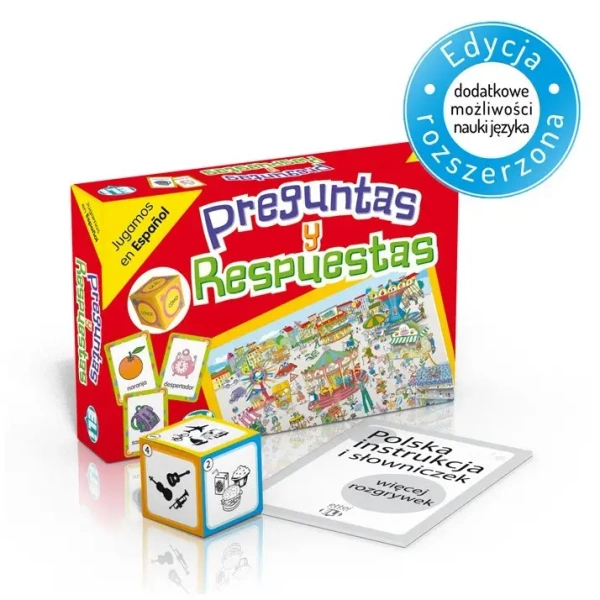 "Preguntas y Respuestas" to innowacyjna gra językowa, która umożliwia ćwiczenie zaimków pytających w języku hiszpańskim oraz rozwijanie zdolności do formulowania pytań w tym języku. Gra ma formę tradycyjnej planszówki.Stopień skomplikowania