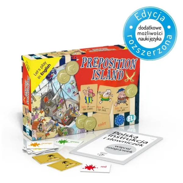Gra językowa Preposition Island przenosi nas do klimatu morskich przygód, skarbów i piratów. Jest to świetny sposób na praktyczne przyswojenie angielskiego słownictwa związanego z określaniem położenia osób i przedmiotów w przestrzeni. Typ gry: To jest gra planszowa. Poziom trudności: Poziom trudności to A1, ale gra nadaje się również dla osób na poziomach wyższych. Ta gra językowa daje możliwość dostosowania poziomu trudności do umiejętności graczy, co czyni ją uniwersalnym narzędziem do nauki, zarówno dla początkujących, jak i zaawansowanych uczniów języka angielskiego. Co znajduje się w skład zestawu? W skład gry wchodzi dwustronna plansza - jedna strona przedstawia piracką wyspę, a druga służy do ilustrowania relacji przestrzennych. Dodatkowo, w zestawie znajduje się osiem kart z odpowiednimi przyimkami miejsca, takimi jak in front of, behind, next to, between, under, above, on, inside. Komplet zamyka talia kart reprezentujących postacie, wraz z półkompletnymi zdaniami opisującymi ich lokalizację na planszy, które należy uzupełnić o brakujący przyimek. Wszyscy uczestnicy obserwują planszę, a następnie każdy z nich kolejno wybiera kartę z postacią pirata i niekompletnym zdaniem. Celem gry jest znalezienie na planszy wybranej postaci i uzupełnienie zdania o odpowiedni przyimek. Za każde poprawne uzupełnienie zdania gracz zdobywa żeton - złotą monetę. Osoba, która zdobędzie najwięcej żetonów wygrywa! Preposition Island zapewnia nie tylko dobrą zabawę, ale przede wszystkim efektywną naukę angielskiego na różnych poziomach zaawansowania.EAN: 9788853613622