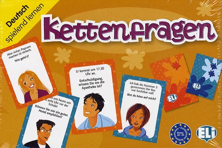 Kettenfragen to pedagogiczne narzędzie, stworzone z myślą o poprawie umiejętności zadawania pytań i prowadzenia krótkich konwersacji w języku niemieckim. Kolejnym celem gry jest utrwalenie różnych form czasowników.Gra koncentruje się na łączeniu pytań z odpowiedziami, które są zawarte na kartach wybranych przez graczy. Zasady są proste - osoba, która zaczyna, odczytuje pytanie z wybranej karty, a obowiązkiem reszty uczestników jest jak najszybciej odnaleźć odpowiedź na to pytanie na jednej z pozostałych kart. Kiedy odpowiedź zostanie odczytana, kolejne pytanie pojawia się poniżej. Poprawna odpowiedź na ostatnie postawione pytanie zawsze znajduje się na karcie, od której rozpoczęto grę. Osobą, kończącą rundę będzie ta, która zadała pierwsze pytanie.