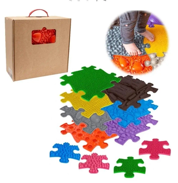 Prezentowany zestaw składa się z 7 większych mat oraz 4 mniejszych, każda o innej fakturze, które pobudzają zmysł dotyku dziecka i uczą rozróżniania różnych struktur powierzchni. Zestaw zawiera następujące rodzaje mat: