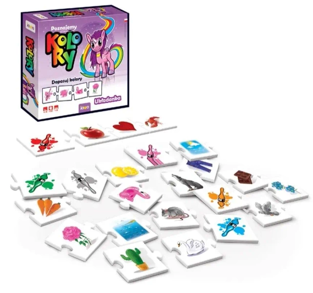 Nasz otaczający świat jest nieskończonym kalejdoskopem barw. Poznajemy Kolory to edukacyjna układanka, która pomaga maluchom nauczyć się rozróżniania różnych kolorów. Gra jest nie tylko zabawą, ale również efektywnym narzędziem do nauki rozpoznawania barw przedmiotów, roślin, czy zwierząt. Zestaw składa się z 48 części do składania: każdy zestaw zawiera 12 różnych kolorów, które dzieci dobierają do siebie, tworząc ładne połączenia. Przegranym jest czarny kolor, a wygranym - wszystkie kolory tęczy. Jak mawiał kiedyś refren znanej piosenki: "Czarne przegrywa, kolor wygrywa, w kolory grajmy dziś". Zapraszamy więc do zabawy kolorami i nauki przez zabawę!EAN: 5901838002974