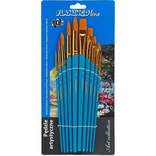 Zestaw zawiera 10 pędzli w różnych kształtach: 5 okrągłych i 5 płaskich, co daje dużą różnorodność i pozwala na tworzenie szerokiego zakresu efektów malarskich. Oznaczenia pędzli: okrągłe pędzle występują w numerach: 2, 6, 10, 14, 18, podczas gdy płaskie pędzle z włosiem prosto zakończonym mają numery: 2, 6, 10, 14, 18. Pędzle są pakowane w blistrach, dla bezpieczeństwa i wygody klientów.