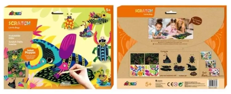 Wydrapywanka z motywem owadów to zabawna i interesująca propozycja dla małych artystów. Dzięki prostej technice wydrapywania dzieci mogą stworzyć piękne i unikatowe figurki z minimalnym wysiłkiem. Wystarczy zdrapać powierzchnię, by ujawnić kolorowy obrazek i odtworzyć ruchome elementy 6 uroczych owadów. W pakiecie znajdują się:- 2 ilustracje do wydrapywania z motywem przyrody,
