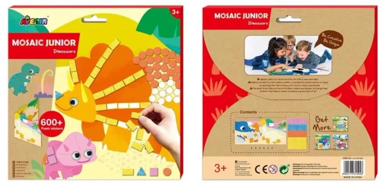 Odkryj świat prehistorycznych stworzeń i kreatywnej zabawy z mozaiką dinozaur od Avenir. Ten zestaw pozwala dzieciom na stworzenie pięknych, kolorowych dzieł sztuki z łatwością i zabawą. Wykorzystaj duże piankowe naklejki, aby tworzyć niezwykły obrazek dinozaura - wystarczy dopasować naklejki do ilustracji zgodnie z kształtem i kolorem. Ta interaktywna zabawka nie tylko służy do dekoracji, ale także pomaga dzieciom w rozwijaniu swojej koordynacji ruchowej oraz postrzegania kolorów. Dopasowując piankowe naklejki do odpowiednich miejsc na ilustracji, dzieci ćwiczą swoje umiejętności manualne oraz poprawiają koncentrację. W komplecie znajdziesz: - 2 obrazki do ozdabiania: wybierz swój ulubiony dinozaur i ozdób go kreatywnymi naklejkami. - Piankowe naklejki: różne kształty i kolory, które doskonale pasują do ilustracji, pozwalają Ci na stworzenie efektownego dzieła sztuki. - Naklejki oczu: dodaj żywy charakter swojemu dinozaurowi, przyklejając mu oczy. - Patyczek: użyj do łatwiejszego manipulowania małymi elementami naklejek. Mozaika dinozaur Avenir to idealny sposób na kreatywną zabawę dla każdego małego fana prehistorii. Pozwól swojemu dziecku rozwijać swoje zdolności artystyczne, tworząc własne, unikalne kompozycje z dinozaurami.EAN: 6920773315948