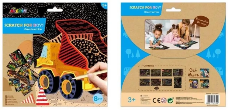 Wydrapywanka Konstrukcje Avenir Scratch zawiera w sobie: - 4 wydrapywanki o tematyce budowlańczej, - patyczek do zdrapywania, - kolorowe muliny.Terapia zabawką kreatywną