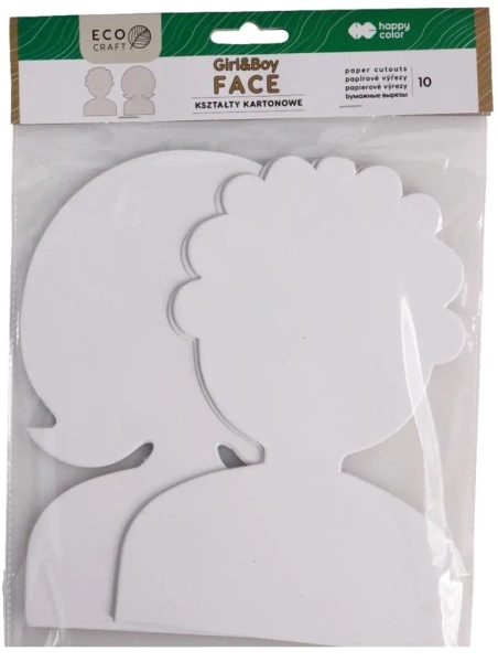 Zestaw zawiera 10 kształtów twarzy wykonanych z kartonu o gramaturze 300 g. Każda twarz ma wysokość 20 cm, co nadaje jej idealne proporcje.