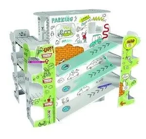 Dzięki zawartości tych pudełek i własnej wyobraźni dzieci stworzą niepowtarzalny parking i ozdobią go na tysiąc różnych sposobów. Można kolorować kredkami, flamastrami i farbami. Papierowe budowle mają lekką, ale stabilną i trwałą konstrukcję, a co najważniejsze, gwarantują długie godziny doskonałej zabawy. Zdjęcie pokazuje złożone i pokolorowane szablony.