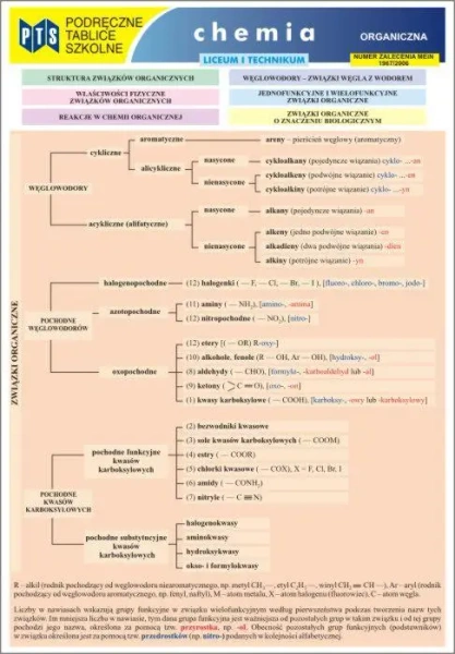 W skład części pierwszej, czyli chemii ogólnej i nieorganicznej, wchodzą takie tematy jak: podstawowe terminy chemiczne, prawa chemii, energetyka reakcji chemicznych, kinetyka i równowaga chemiczna, układ okresowy pierwiastków, struktura substancji, roztwory, utlenianie i redukcja oraz elektrochemia. Z kolei, druga część, czyli chemia organiczna, skupia się na tematach takich jak: struktura związków organicznych, właściwości fizyczne związków organicznych, reakcje chemiczne, węglowodory, jedno- i wielofunkcyjne związki organiczne oraz związki organiczne o znaczeniu biologicznym. Tablice te mają zatwierdzenie recenzentów pod względem merytorycznym i językowym. Zgodnie z ich oceną, tablice szkolne - Chemia organiczna spełniają wszystkie wymogi stawiane środkom dydaktycznym, w tym wymogi jakości technicznej. Ponadto, estetyka tablic nie budzi zastrzeżeń. Recenzenci jednogłośnie podkreślają, że zastosowanie tego środka dydaktycznego pozwoli na kształcenie kompetencji w zakresie wyszukiwania i przetwarzania informacji.EAN: 5907458787093
