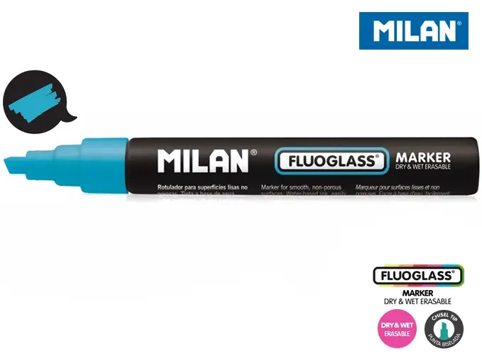 Marker Milan fluoglass to niezastąpione narzędzie do tworzenia i rysowania na gładkich, nieabsorpcyjnych materiałach takich jak okna, lustra czy tablice. Zakończony na końcu ściętą końcówką pozwalającą na pisanie o grubości 2 mm i 4 mm.