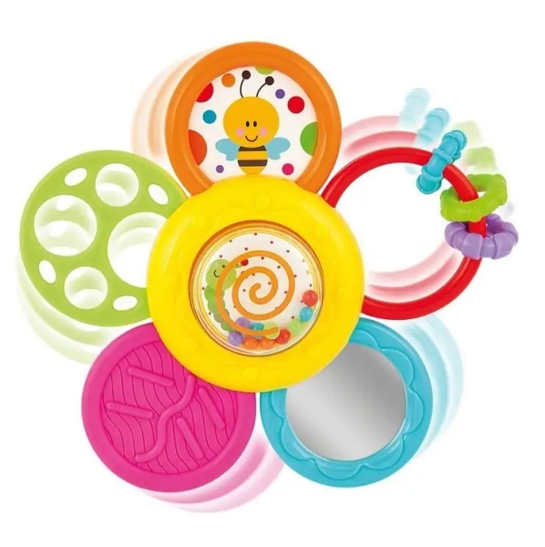 Zabawka Stokrotka Grzechotka Smily Play posiada pięć kolorowych płatków, z których każdy ma inną funkcję do odkrycia przez malucha. Zaprojektowana z myślą o bezpieczeństwie i rozwijaniu różnych umiejętności dziecka. Grzechotka, gryzak i więcejTen innowacyjny produkt łączy w sobie kilka elementów, takich jak grzechotka, miękki gryzak, bezpieczne lusterko i piszczałka. Dodatkowo, Stokrotka Grzechotka może być przymocowana do gładkiej powierzchni za pomocą przyssawki, co dodaje jej jeszcze więcej możliwości zabawy. Obracanie stokrotką