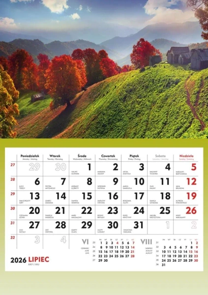 Wymiary i przemyślany układKalendarz ma wymiary 310 x 482 mm, dzięki czemu stosunkowo duża powierzchnia pozwala na wygodne oznaczanie ważnych wydarzeń i spotkań. Przejrzysty układ kalendarza z jednym miesiącem na każdej kartce sprawia, że łatwo można śledzić najbliższe plany.